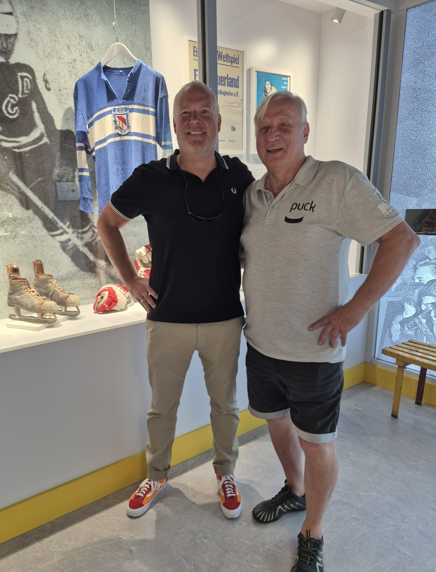 Carsten Dieckmann, der seine über 15-jährige aktive Eishockeyzeit am Seilersee ausschließlich im Nachwuchs verbracht hat, ließ sich von ECD-Legende Dieter Brüggemann kurzweilig durch das Eishockey-Museum führen.