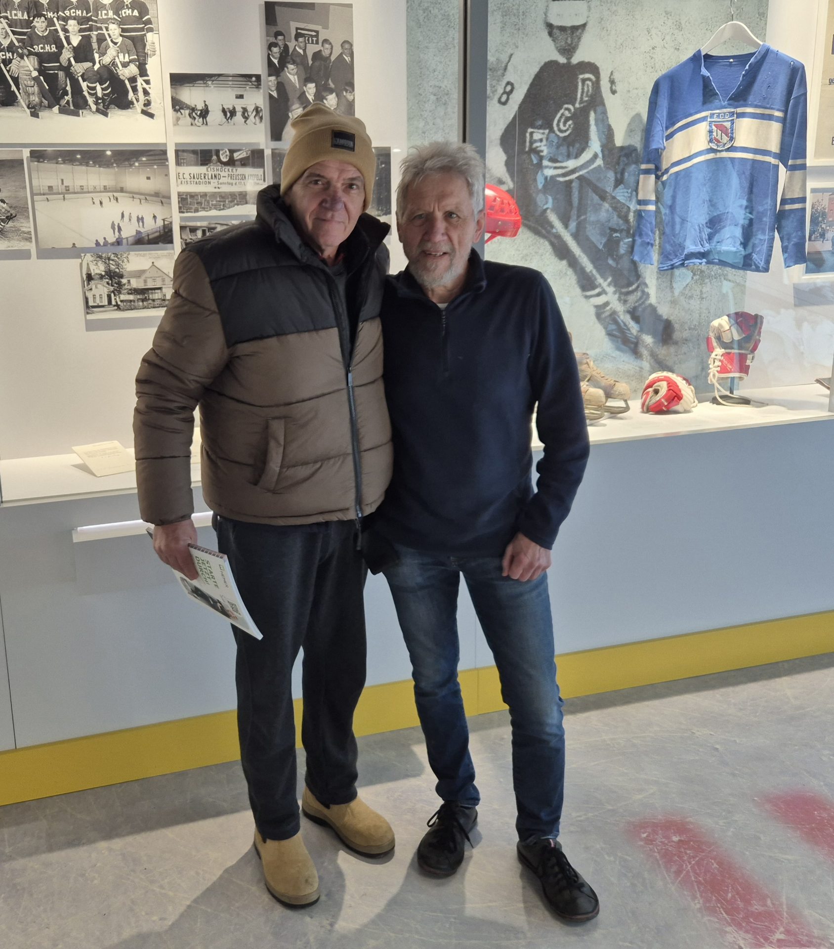 Einen Tag vor seinem Rückflug nach Australien hat der gebürtige Iserlohner Helmut John am Samstag mit seiner Ehefrau und Iserlohner Freunden das Eishockey-Museum besucht. John wanderte 1979 nach Australien aus, wohnt jetzt in einem Vorort von Melbourne und ist seit einem Jahr Rentner. Helmut John hat ECD-Wurzeln. Helmut John und Museums-Gründer Rainer Tüttelmann (r.) haben sich letztmals vor 48 Jahren gesehen.